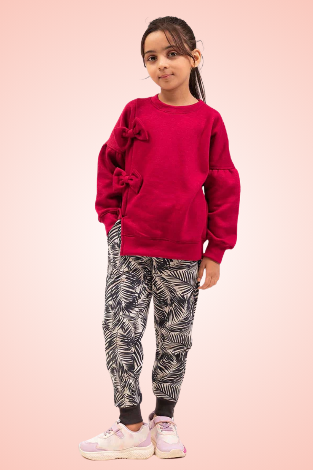 Maroon Bow Sweetshirt Leafe Printer Trauser Set