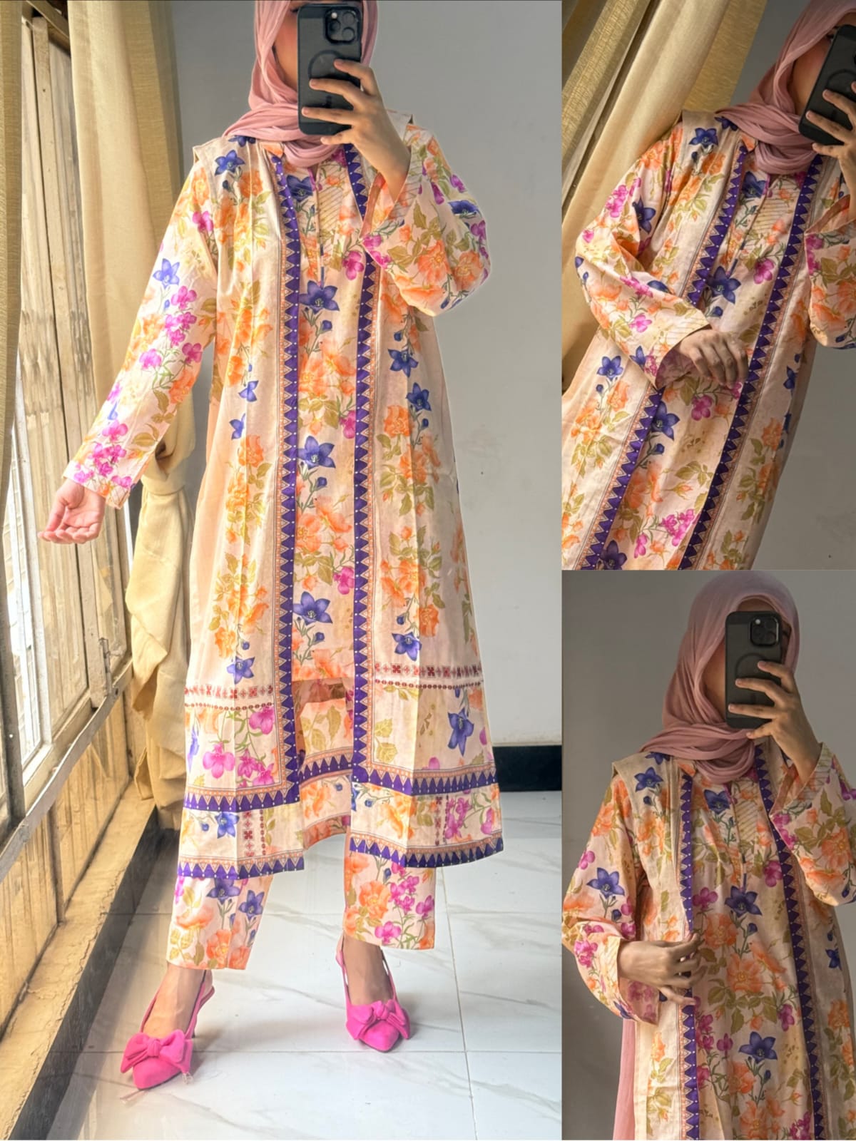 Elevate your wardrobe with this premium digital lawn three-piece, blending eastern elegance with a western edge. Featuring a sleek shirt and trouser, complemented by a front-open long gown, this ensemble redefines contemporary sophistication